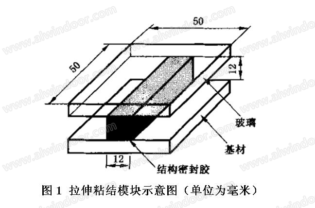 按照GB 16776-2005将混合好的硅酮结构密封胶填充在不锈钢和玻璃中间制成拉伸粘结模块(如图1)。制备好的试样在标准条件下养护后(双组分养护时间为14天),分别测试试样在 23℃、90℃、-30℃、浸水、水紫外300h后的拉伸粘结强度,粘结破坏面积;以及23℃时最大拉伸强度时伸长率。
