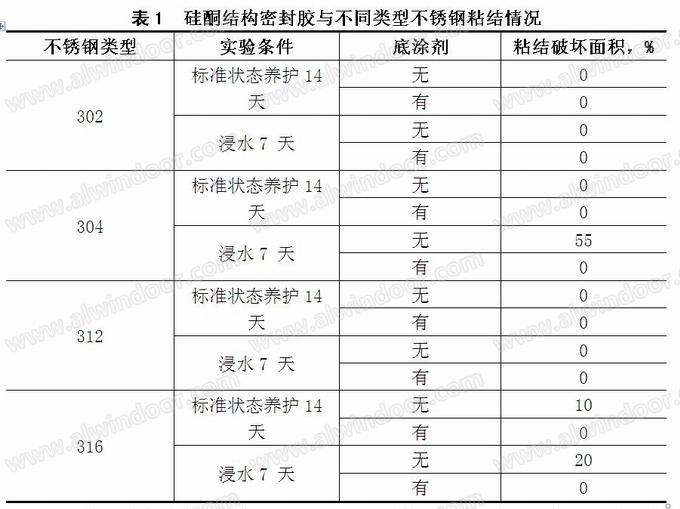 由表1可以看出,在标准条件下养护14天后,硅酮结构密封胶对大部分类型的不锈钢均具有良好的粘结性。硅酮结构密封胶对304和316不锈钢在浸水7天后,均出现明显的粘结破坏属于粘结不良,但涂刷底涂剂后粘结破坏面积为0%,说明底涂剂可以促进硅酮结构密封胶与不锈钢之间的粘结力。因此我们在实际工程选用硅酮结构密封胶与不锈钢进行结构粘结时必须进行剥离粘结性测试,确保最终粘结效果。