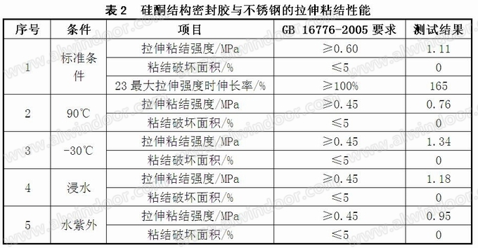 拉伸粘结性能主要检测结构胶拉伸粘结强度和23℃时最大拉伸强度时伸长率。硅酮结构密封胶良好的拉伸粘结强度可以将幕墙板片牢牢的粘结在附框(词条“附框”由行业大百科提供)上,抵抗风压和板片自重。适宜的弹性伸长率赋予幕墙灵活的平面变形(词条“变形”由行业大百科提供)能力,以抵抗风压。根据剥离粘结性测试结果表明,硅酮结构密封胶对各种类型的不锈钢均能实现良好的粘结。我们选择应用最广的304不锈钢进行下一步的研究工作,拉伸粘结性能测试结果见表2。